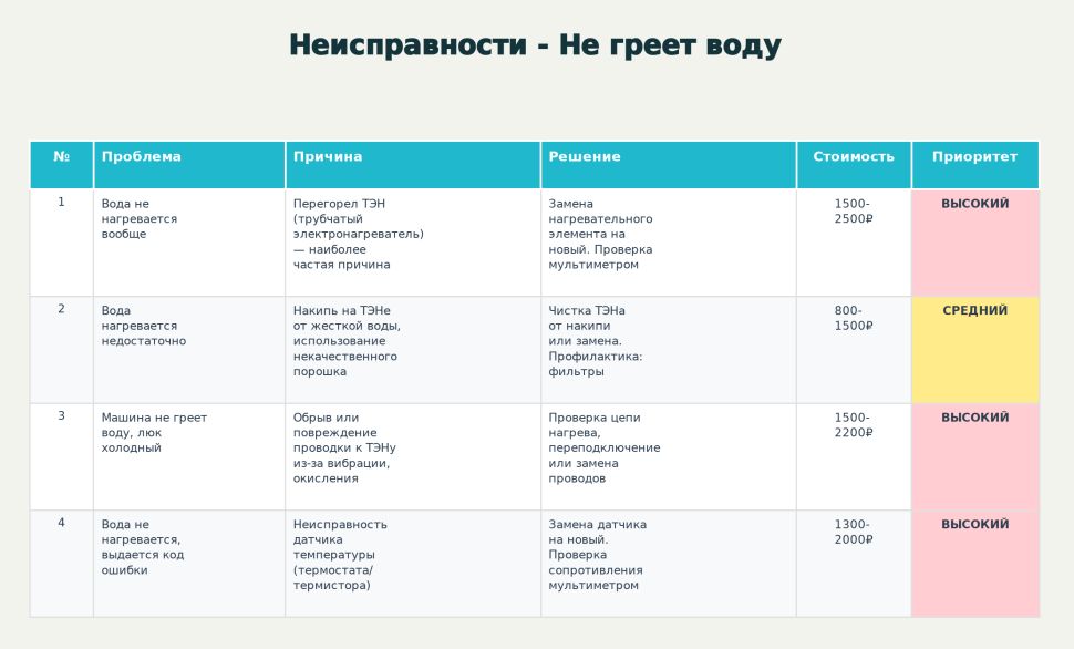 Таблица неисправностей стиральной машины - не греет воду